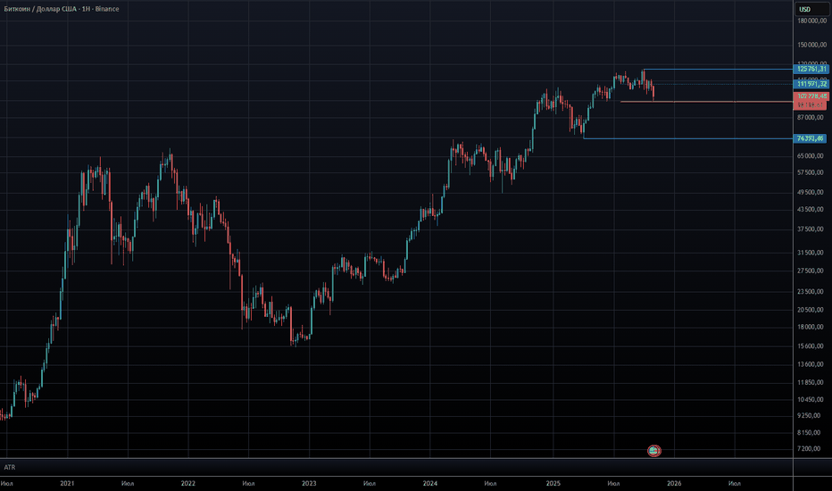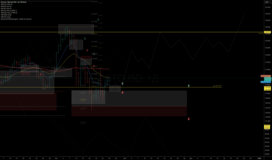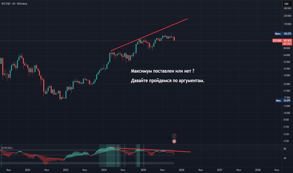 Закрытия ниже 102 тыс (особенно на недельных сессияж) станут первым сигналом к возможному завершению текущего цикла роста и переходу в фазу макро-коррекции.